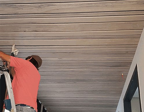 Afhankelijk van de duurzaamheid van het hout vergrijst en verweert elke houtsoort door aanraking met water en zonlicht. Buitenshuis gaat dit proces uiteraard sneller, maar ook binnen heeft hout bescherming nodig tegen vocht, vuil en UV-stralen. Om de gewenste uitstraling van uw houten wand te realiseren én een lange levensduur te garanderen is een vakkundige afwerking daarom essentieel. Wij werken de houten wandbekleding af in eigen huis: in vrijwel elke gewenste RAL-kleur, zowel dekkend als transparant met moderne, matte verfsystemen.