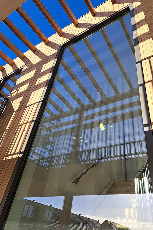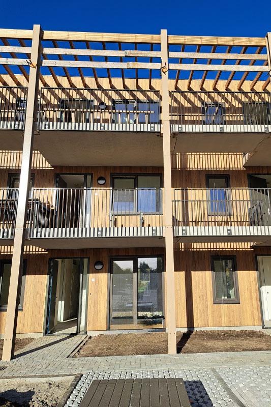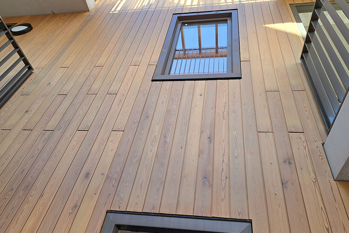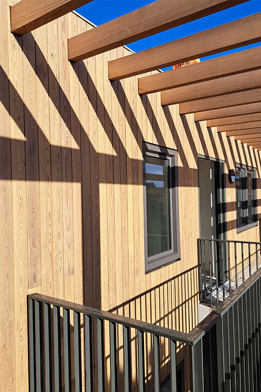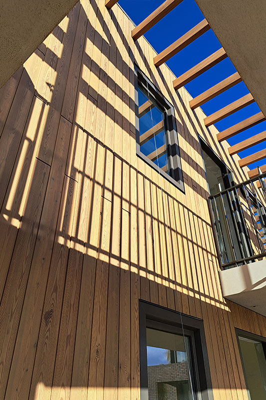 Veteka verzorgde de maatwerk gevelbekleding, uitgevoerd in Lariks met een blokprofiel (enkel). Lariks staat bekend om zijn duurzaamheid en karakteristieke vlamtekening. Om te voldoen aan de strengste veiligheidseisen is het hout ook brandvertragend behandeld met Burnblock®, onze 100% biologische afbreekbare brandvertrager.